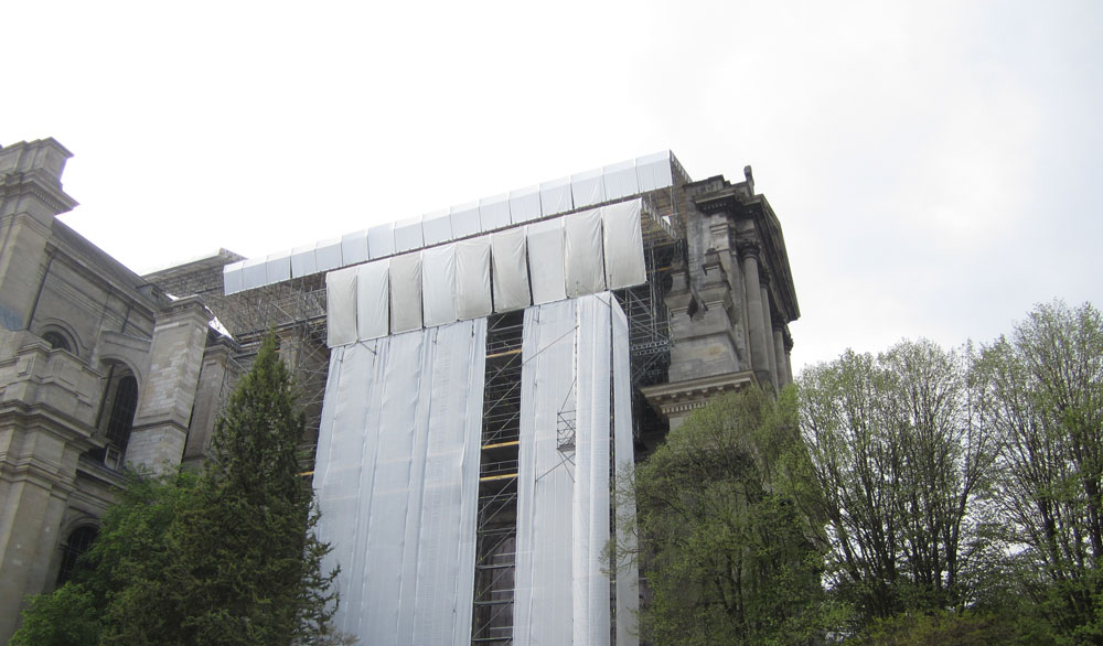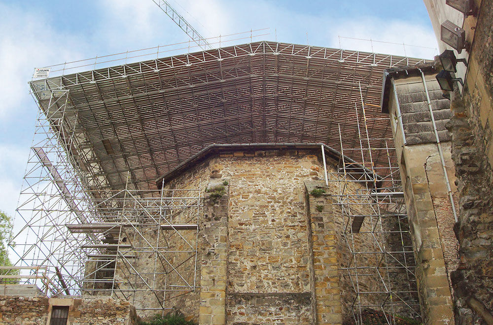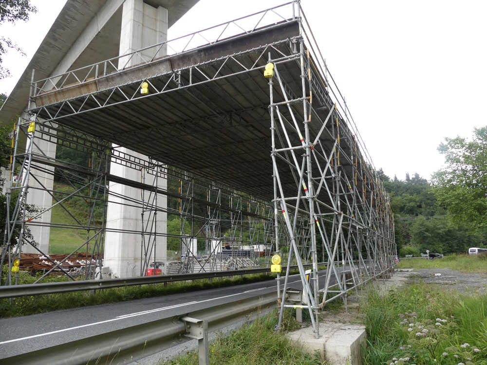 As proteções são adicionadas em diferentes níveis, protegendo os operários na realização dos trabalhos e permitem que por baixo do andaime de proteção o tráfego flua com total segurança. A estrutura de proteção é composta por torres de andaime, treliças e a plataforma de cobertura.
