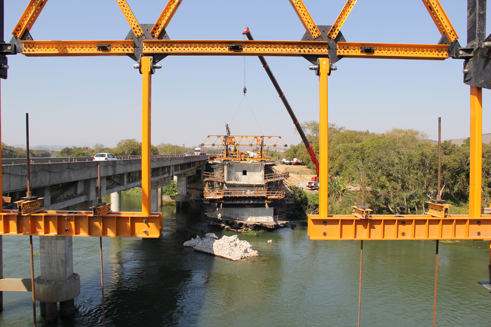 Para construção da nova ponte foi preciso demolir toda estrutura que existia e começar a obra do zero. Por ser construída sobre o rio não é possível montar escoramentos no solo, sendo assim, a técnica escolhida para executar a obra foi o balanço sucessivo.