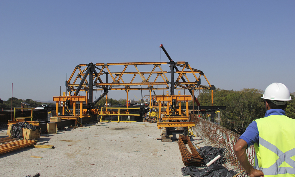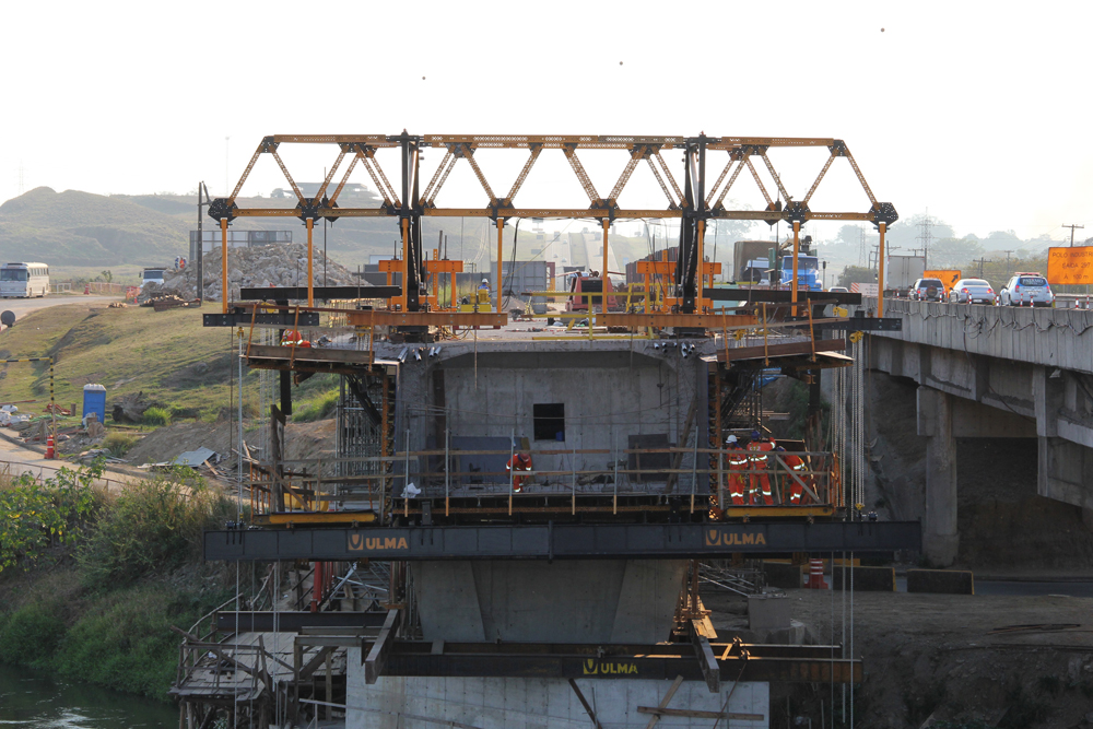 Em conjunto com o balanço sucessivo, esta em utilização a forma ENKOFORM HMK, um sistema versátil que se adapta as pressões de concreto exigidas na obra, proporciona excelente acabamento e se incorpora perfeitamente a estrutura do carro.