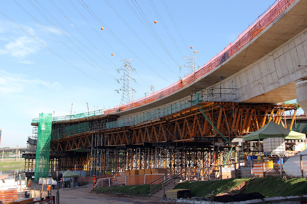 Um dos grandes desafios, além da existência do rio, esta na baixa qualidade do solo, transito intenso e a diversas interferências urbanas, como: linha de trem da CPTM, tubulações enterradas, redes de alta tensão e áreas de preservação, tornando necessária a utilização de diversas soluções de escoramento. Na alça da ponte que sai da Marginal Pinheiros sentido Interlagos, por exemplo, havia a necessidade de torres de escoramento de até 10 metros de altura e treliças com até 15m de comprimento, a solução foi utilizar o versátil Sistema MK.