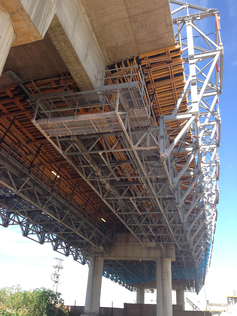 O escoramento T-60, utilizado nas vigas travessas, foi montado na primeira etapa e depois içado para a execução das vigas subsequentes, sem a necessidade de desmontagem, economizando trabalhos de montagem/desmontagem. A alta capacidade de carga desta torre (6 toneladas por poste) reduziu, também, o número de torres trabalhando em conjunto com Perfis Especiais H700 e DW530.