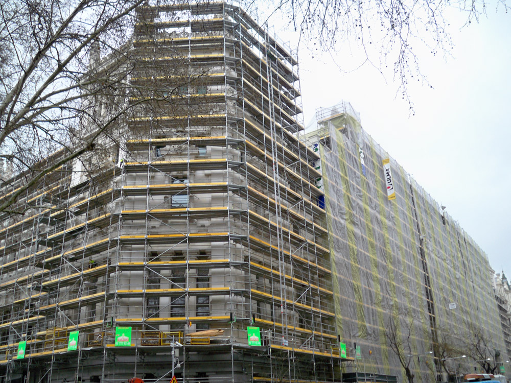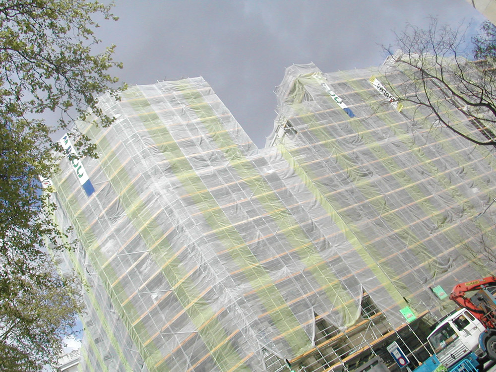 O acesso aos lados das torres e evitar a montagem a partir do solo, requeriu um sistema de andaimes que pudessem voar. O Andaime multidirecional BRIO permitiu. Nas faces cuja montagem foi feita a partir do chão, o andaime DORPA, ideal para trabalhos de fachada, foi utilizado. Para minimizar o impacto sobre a vía pública o Andaime BRIO permitiu efetuar passagens de pedestres.