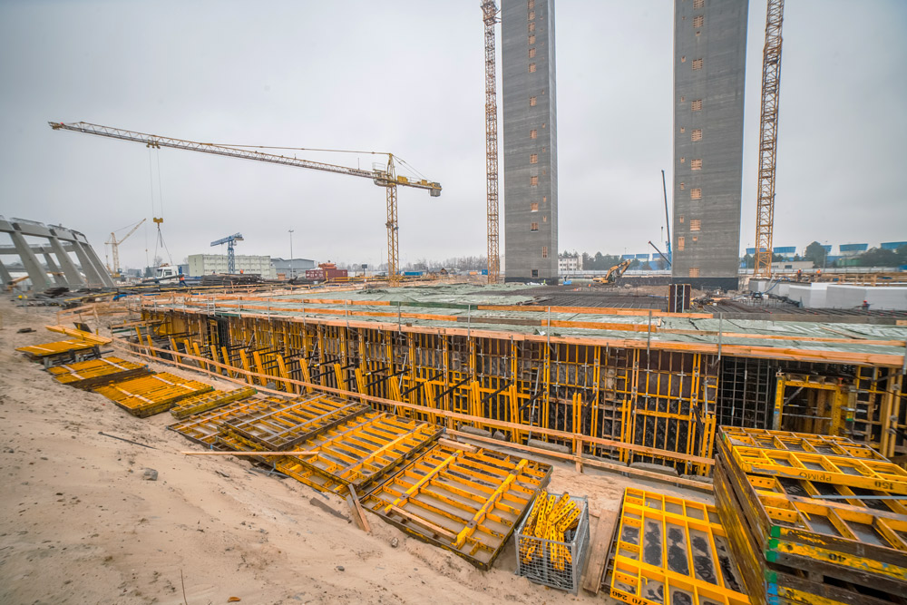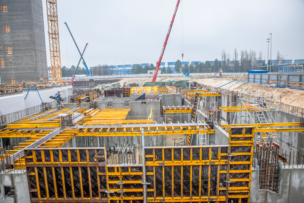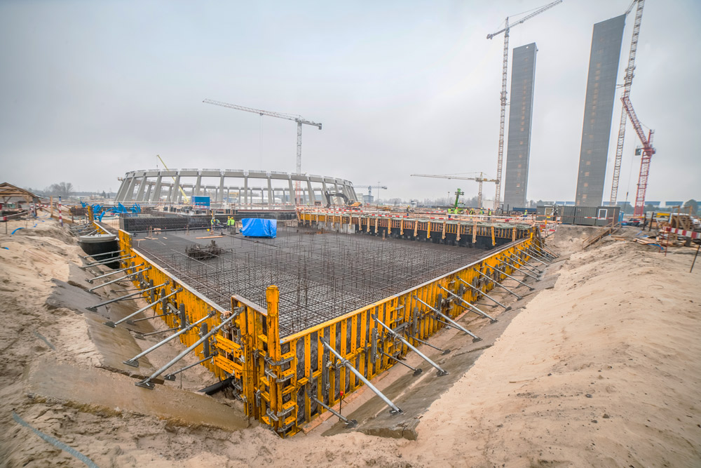 Com dimensão de 87,1 x 63,3 m e alturas entre 3 e 6 m, foi concretado mais de 20.000 m3 de concreto numa só tomada. As paredes sólidas necessárias nas fundações e canalizações foram realizadas com treliças monoface SMK, criadas com riostras MK, compatíveis com qualquer fôrma para parede, neste caso foi