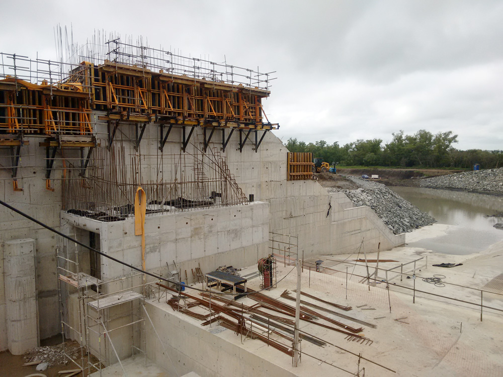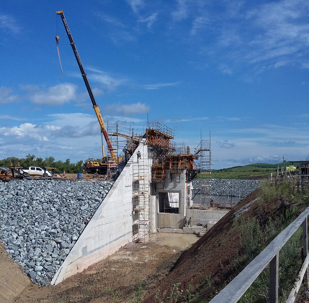 Para a execução das estruturas de captação de água bruta e barragem (paredes, vertedouro e adufa de desvio), foram utilizados mais de 2.400 m² das fôrmas ENKOFORM VMK que se adaptam perfeitamente a estruturas de diversas geometrias e COMAIN sistema de painéis versátil para múltiplos usos, em conjunto com consoles trepantes BMK e SBF, como apoio das estruturas.