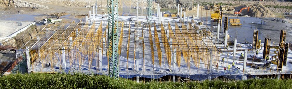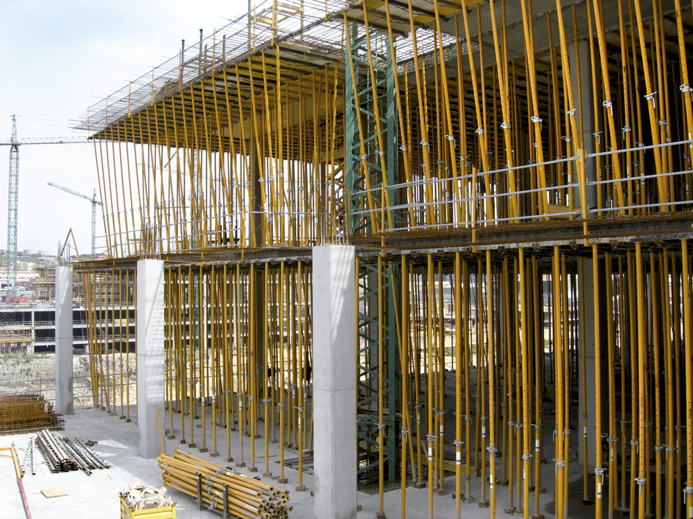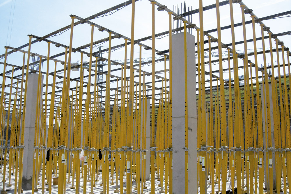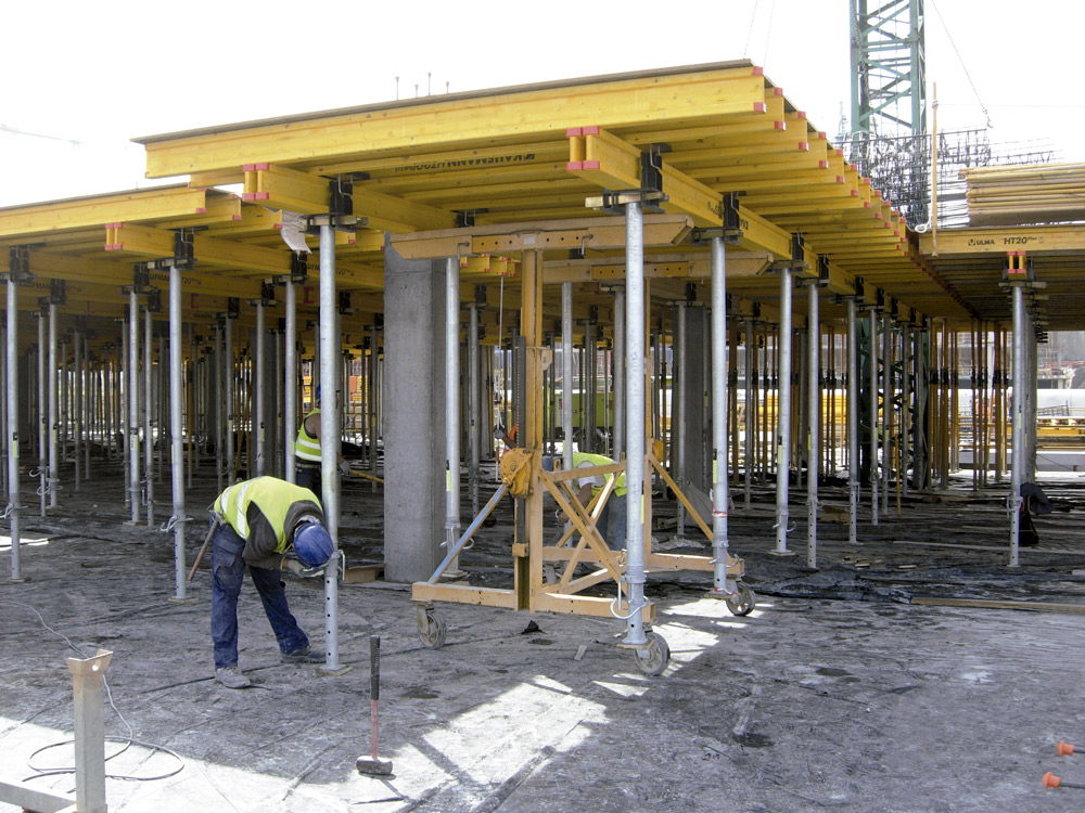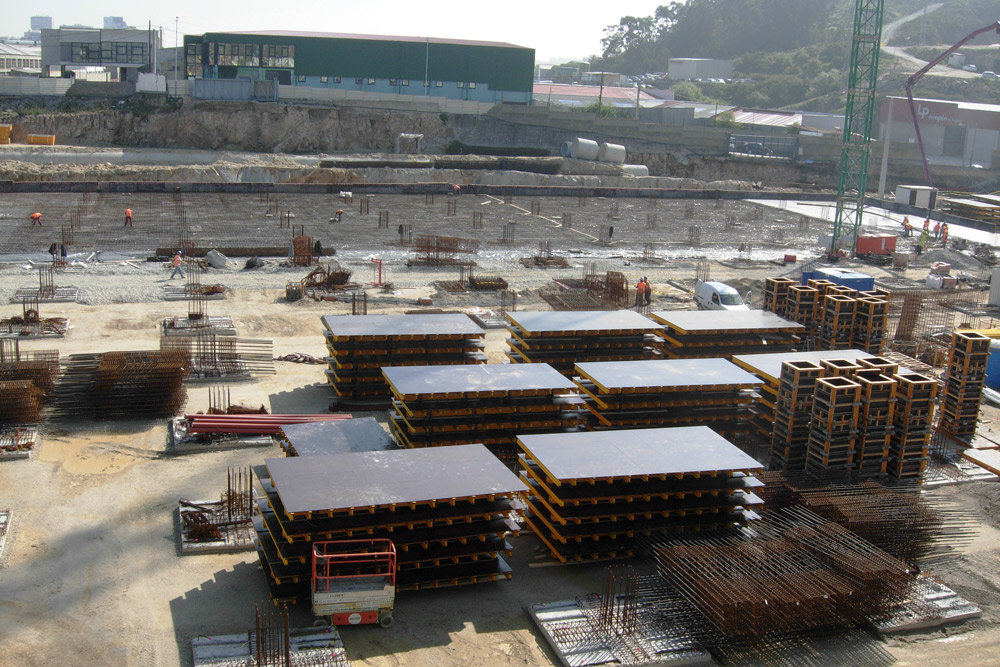 Na execução dos 450.000 m2 de laje, foi utilizada de acordo com as características do projeto, uma combinação entre Mesa VR e fôrma RAPID sobre Cimbre nas maiores alturas e escoras de alumínio ALUPROP e EP nas alturas intermediárias. Estes sistemas permitiram uma grande rentabilidade visto que foram montados no início da obra e deslocados de uma zona para outra dentro da mesma, sem serem desmontados. Para as fôrmas das paredes e pilares de concreto foi utilizado o sistema modular ORMA.