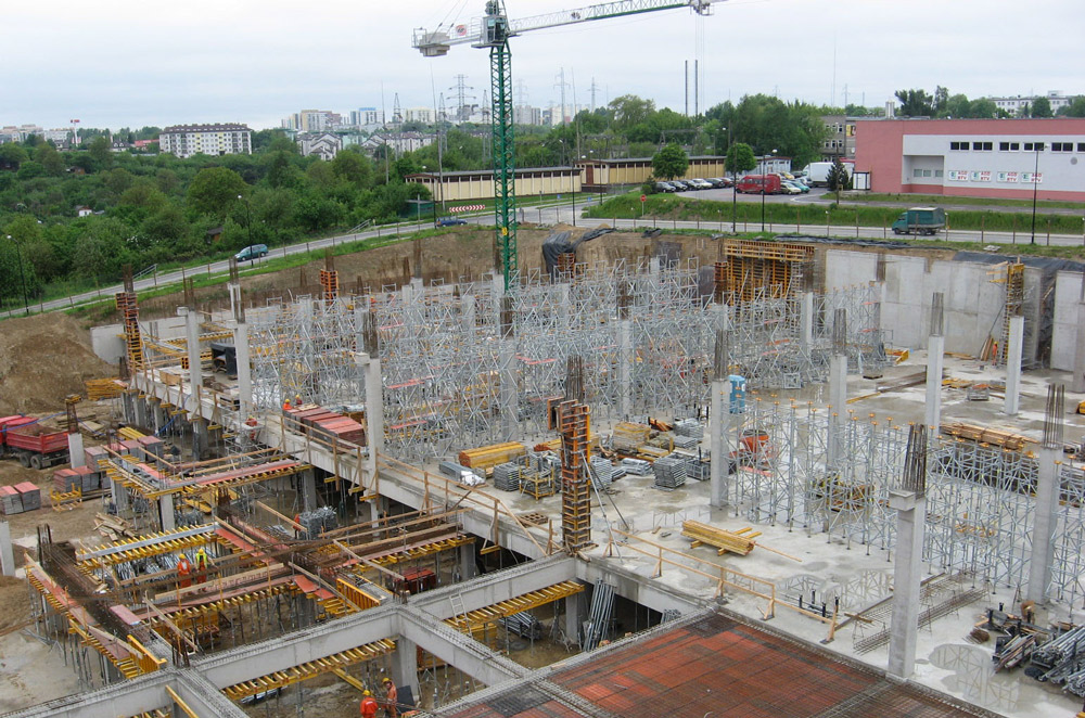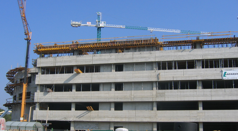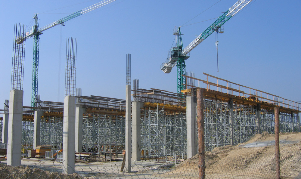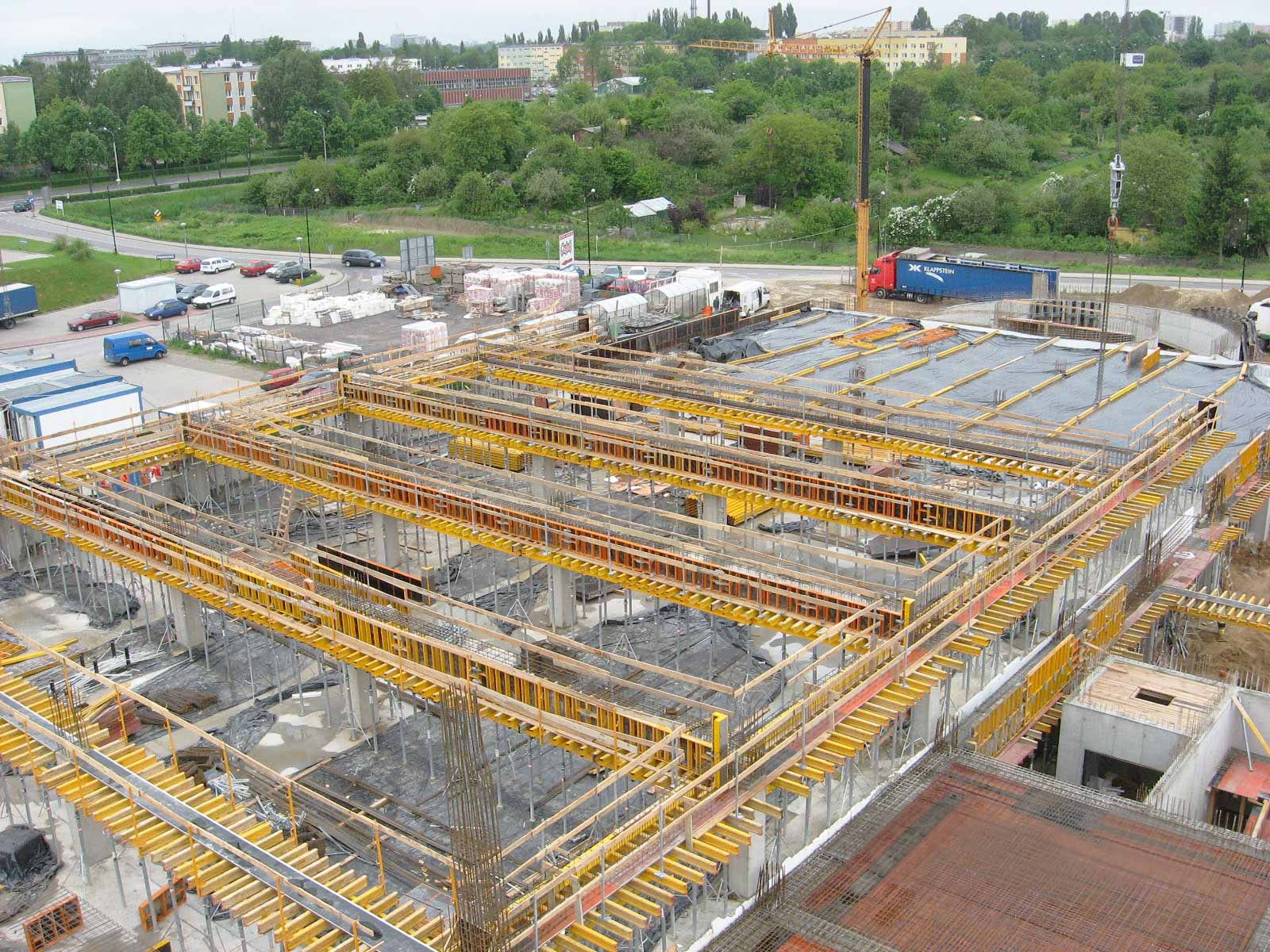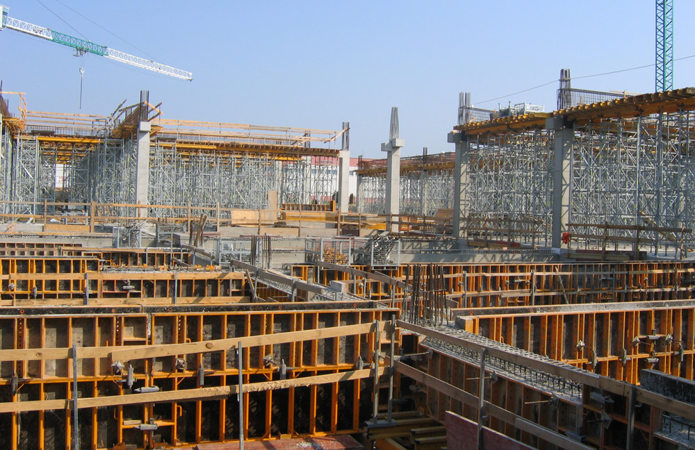 As lajes e vigas de suspensão foram executadas com fôrmas ENKOFLEX sobre Cimbre T-60 e escora ALUPROP. Uma fila adicional de torres de apoio foi colocada ao longo das vigas de suspensão. Assim, foi possível criar uma plataforma de trabalho ampla e segura.