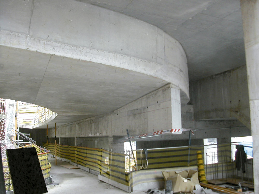 Para solucionar a construção das paredes, foi aplicada a Fôrma ENKOFORM V-100 nas superfícies verticais curvas e em algumas inclinadas. Parte deste sistema foi montado no local, e o restante foi enviado para a obra pré-montado. A adaptação às diversas formas da estrutura às fortes pressões de concretagem foi perfeita.