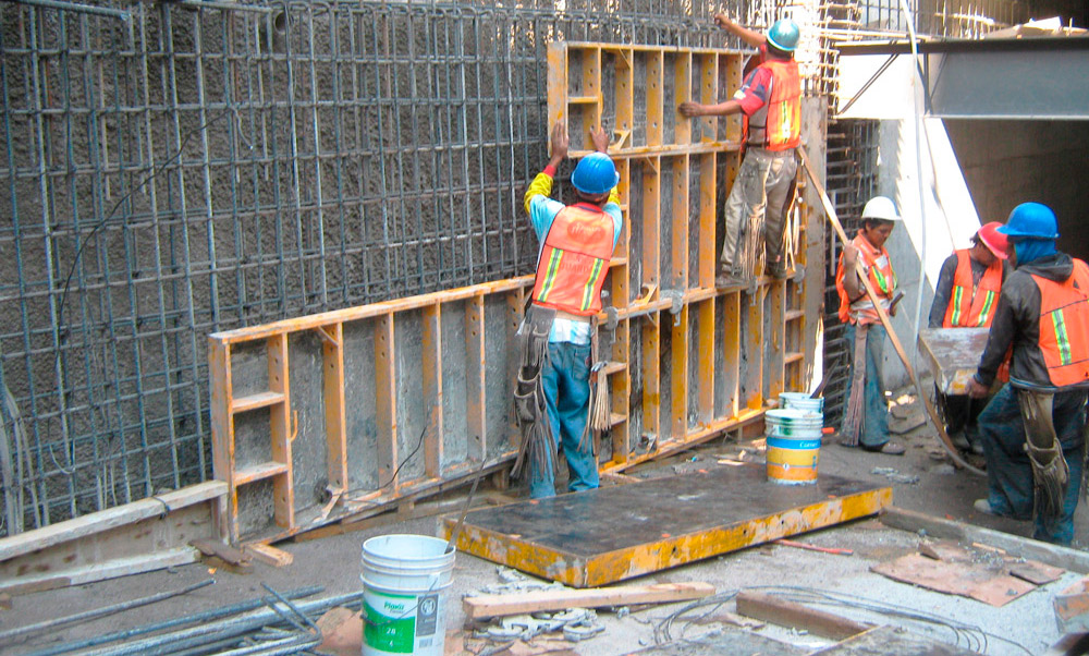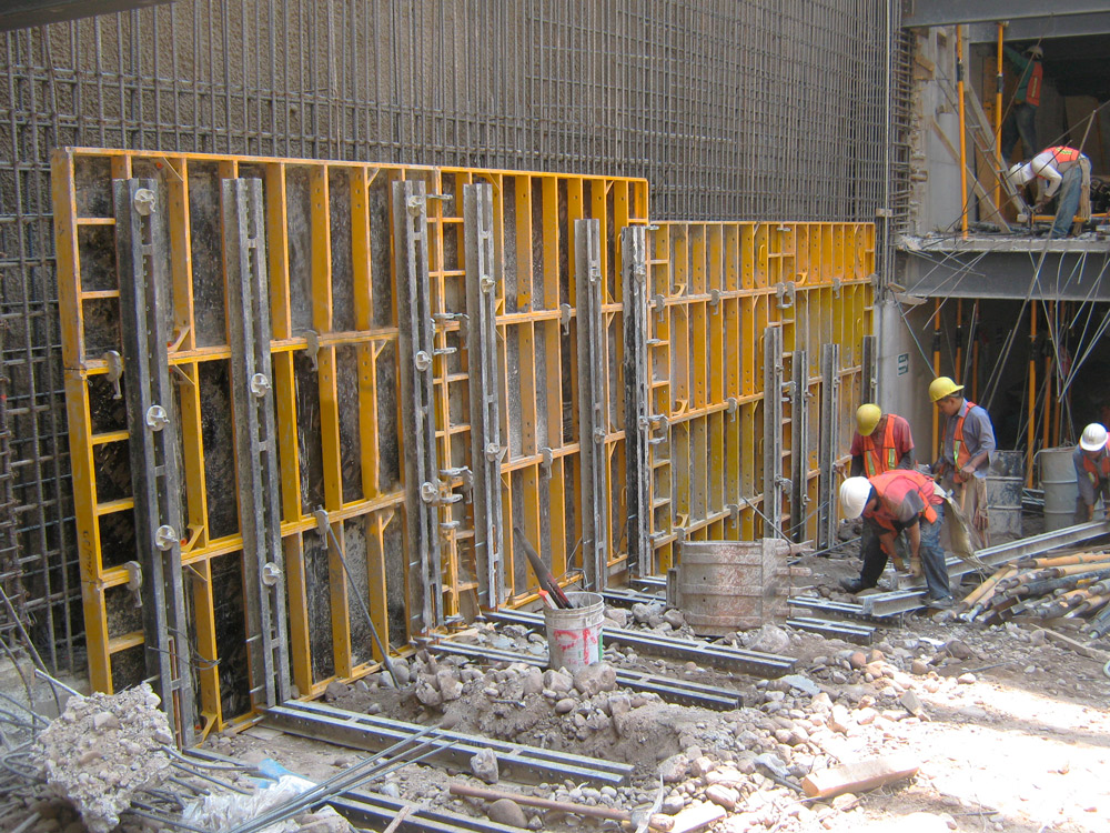 - Paredes com 2,4 m de altura e 14 m de comprimento, situados nos subsolos do edifício. Para sua construção utilizou-se o sistema NEVI, com painéis de 2,4 x 0,9 e 2,4 x 0,6, Tensores E e Riostras DU-100 de 3 e 2,5 m de comprimento.