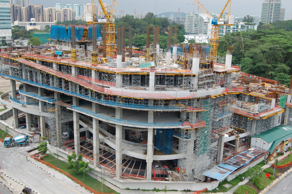 As lajes e vigas de suspensão nos andares foram construídas com Mesas VR e Escoras EP, cuja gama permitiu a adequação às alturas de cada andar. Esta fôrma horizontal foi ideal para todas as lajes e permitiu uma montagem rápida e um consumo mínimo de tempos nos movimentos horizontais e verticais da obra. Nos três primeiros andares, de 11 m cada, foram também utilizadas Mesas VR com Cimbre T-60 e fôrma Horizontal de Vigas de madeira ENKOFLEX.