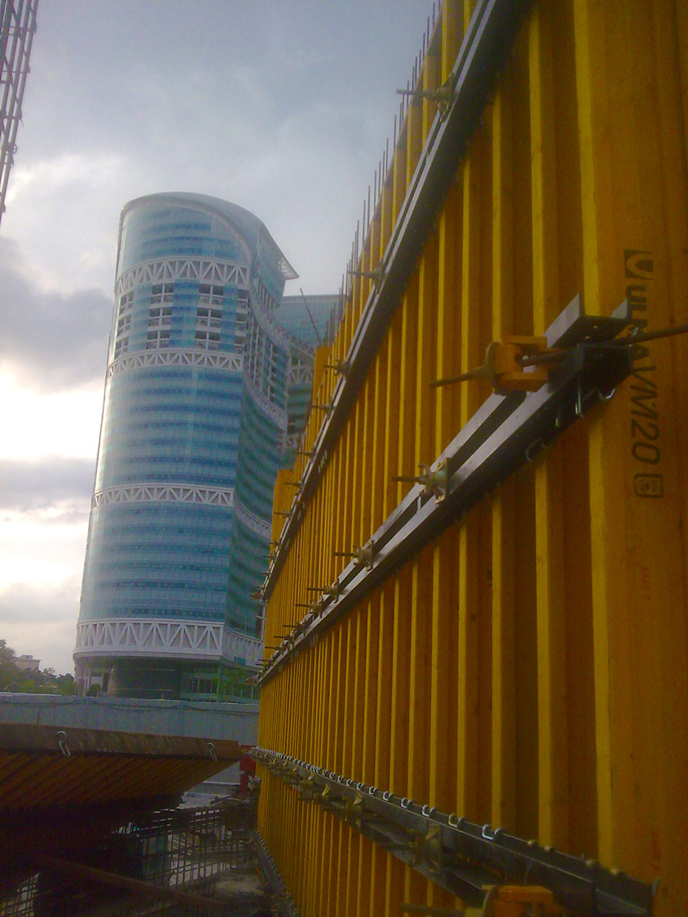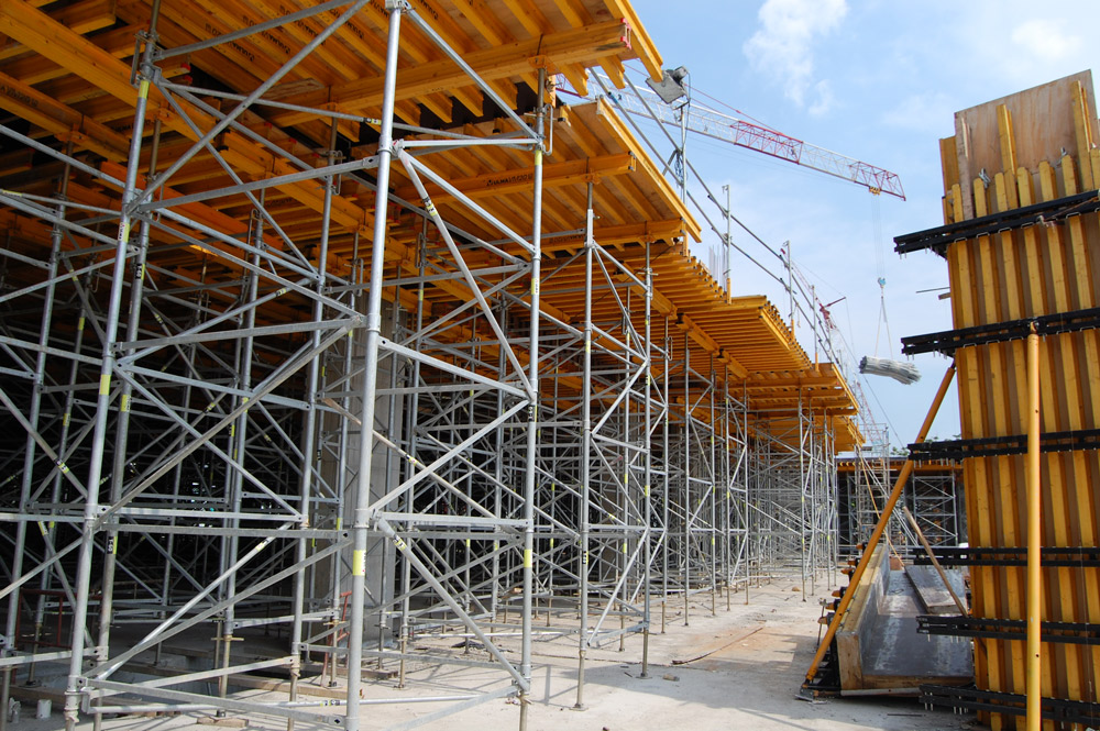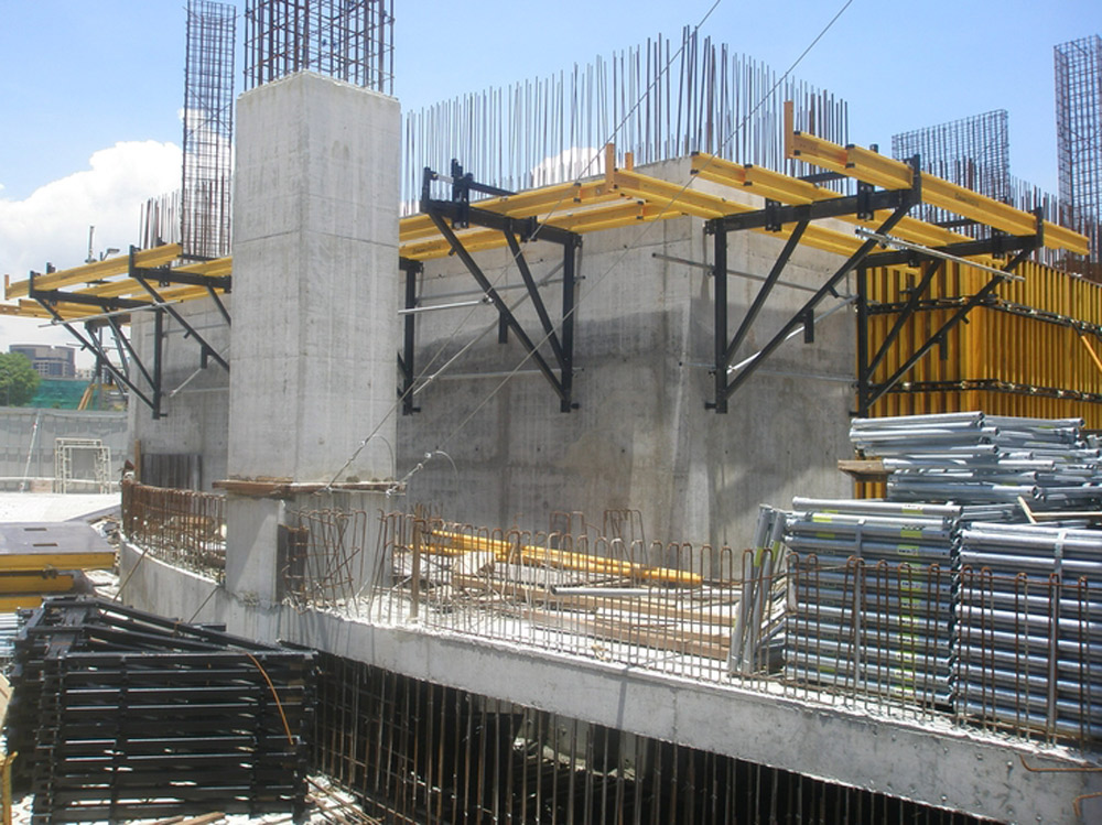 Por se tratar de uma geometria de obra um tanto quanto complexa, os muros e pilares foram executados com a fôrma Vertical ENKOFORM V-100 e com Consoles de trepantes CM-220. Este sistema de escoras é formado por elementos padrão, principalmente por riostras metálicas e vigas de madeira que suportam o tabuleiro, formando painéis à medida em função das características necessárias.