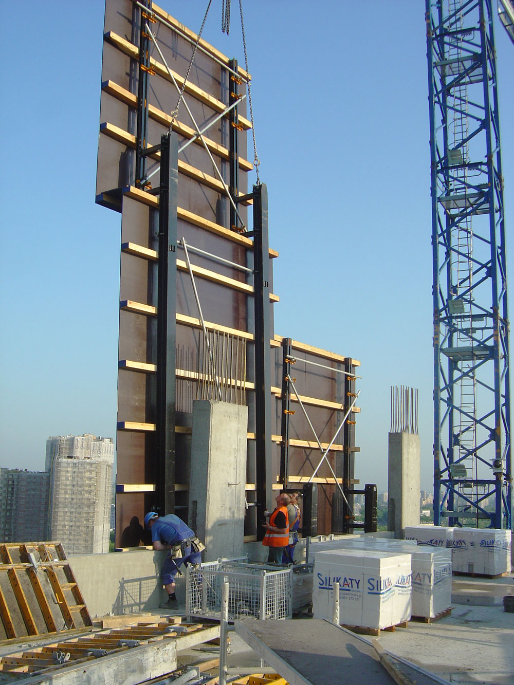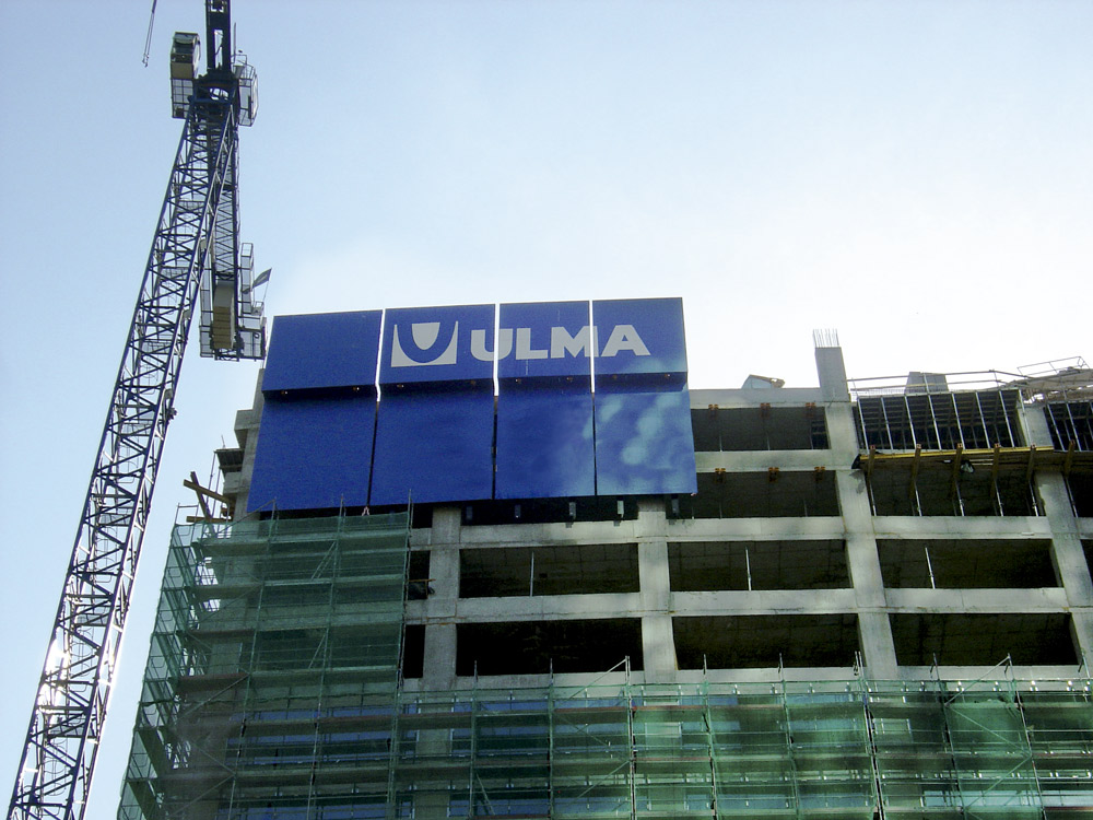 Além disso, foram fornecidas durante três meses 33 proteções perimetrais, de 10,5 m de altura cada uma, utilizadas para tornar seguras as zonas de trabalho ao construir os pisos de forma consecutiva. Assim, os operários puderam trabalhar de forma eficiente e protegidos do vento e das condições climáticas a alturas elevadas. O mecanismo é baseado em um conjunto de dois mastros unidos entre si por vigas de aço e vigas de madeira. Cada mastro, suspenso de um par de cabeçais montados nas lajes, determina o sentido de movimento de cada proteção. Graças à eficácia deste sistema, a execução do perímetro exterior das lajes superiores foi simples, também aumentou consideravelmente o ritmo de trabalho com conseqüente economia de tempo.