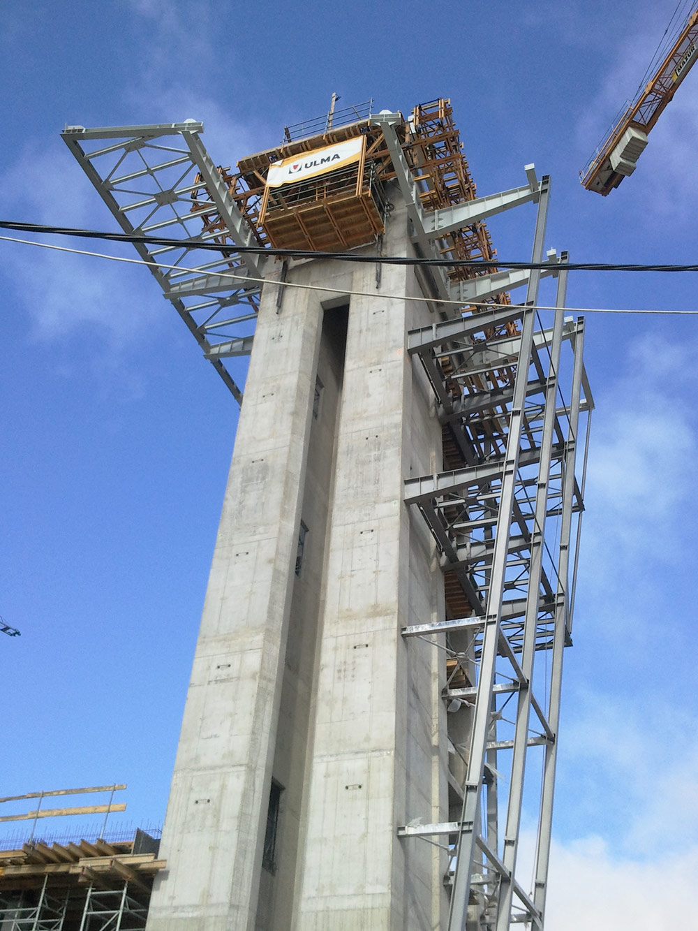 O sistema auto-trepante ATR executou duas das paredes paralelas externas, com 90 cm de espessura. Os dois restantes, com espessuras entre 15 e 25 cm e de elementos estruturais de aço salientes, impediu a utilização do ATR.