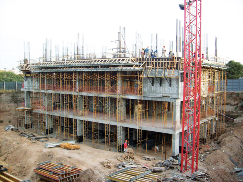 Para a execução de lajes, com espessura de 0,25 m em andares inferiores com alturas livres maiores de 4,5 m, empregou-se a fôrma BTM apoiada com Escoras SP e Cimbre G. As lajes do tipo, com altura de 2,55 m foram apoiadas com Escoras ECO.