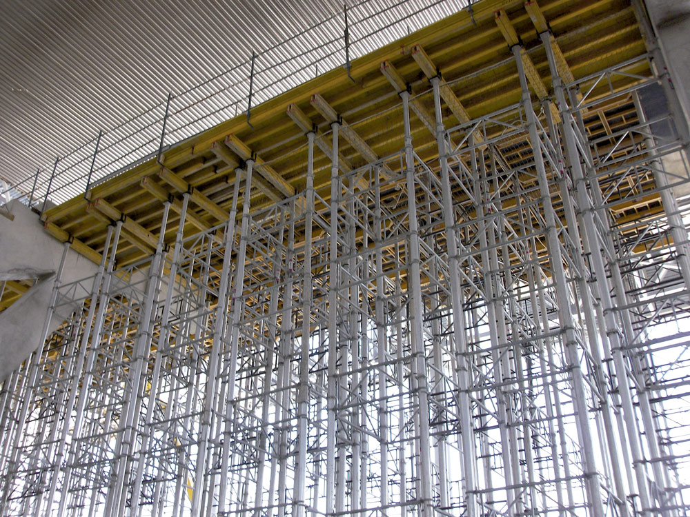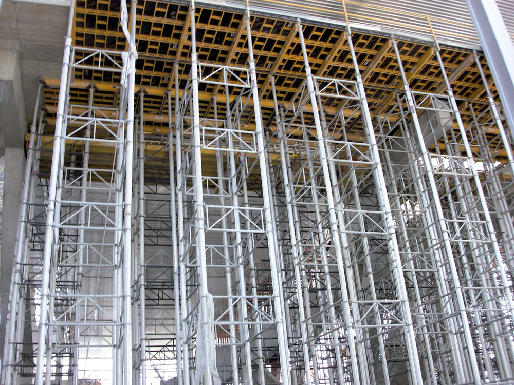 Para os 8 metros de altura exigidos pelo projeto, foram utilizadas Escoras de alumínio ALUPROP dispostas em torres, ou seja, travadas entre si. O potencial do produto, utilizado para a execução das lajes, foi evidente já que não foi necessário desmontar nenhuma das torres de 100 m3, uma vez que após cada utilização, todo o conjunto era deslocado. Dessa forma, foi possível a reutilização de material além de ser obtida uma economia de tempo de mão-de-obra ao evitar a montagem e desmontagem sucessiva.