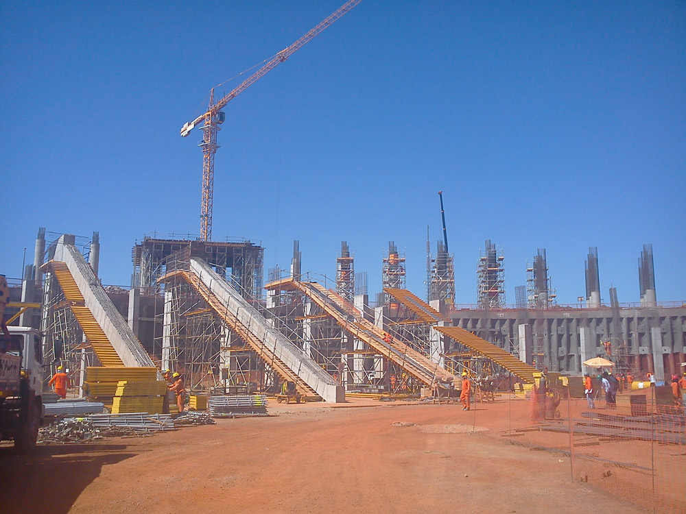 A peculiaridade desse estádio são as 288 colunas de 46 metros de altura em volta do estádio, sobre as quais repousa o anel de compressão. Para a aplicação dos pilares circulares de 1,20-1,50 m de diâmetro foi usada a Fôrma CLR em concretagens sucessivas de 4 m. O sistema de andaime BRIO como plataforma de trabalho, garantiu a segurança dos trabalhadores em grandes alturas.