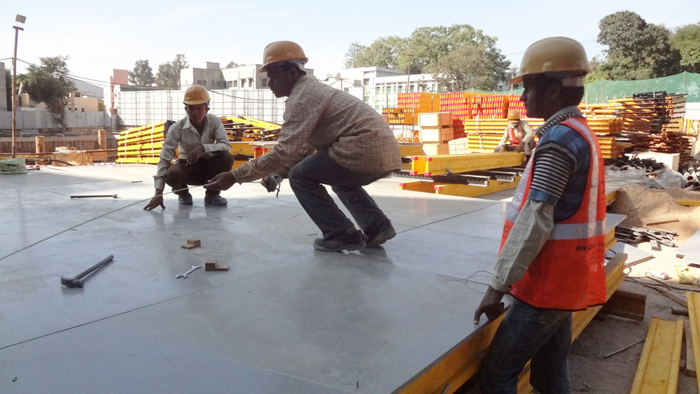 O núcleo central foi construindo-se em todo momento em um ou dois níveis acima das lajes. A fôrma ENKOFORM V-100 foi combinada com o sistema de consoles trepantes BMK na face exterior das paredes e plataformas interiores KSP nas demais faces. O ciclo de concretagem por andar foi calculado em 9 días.