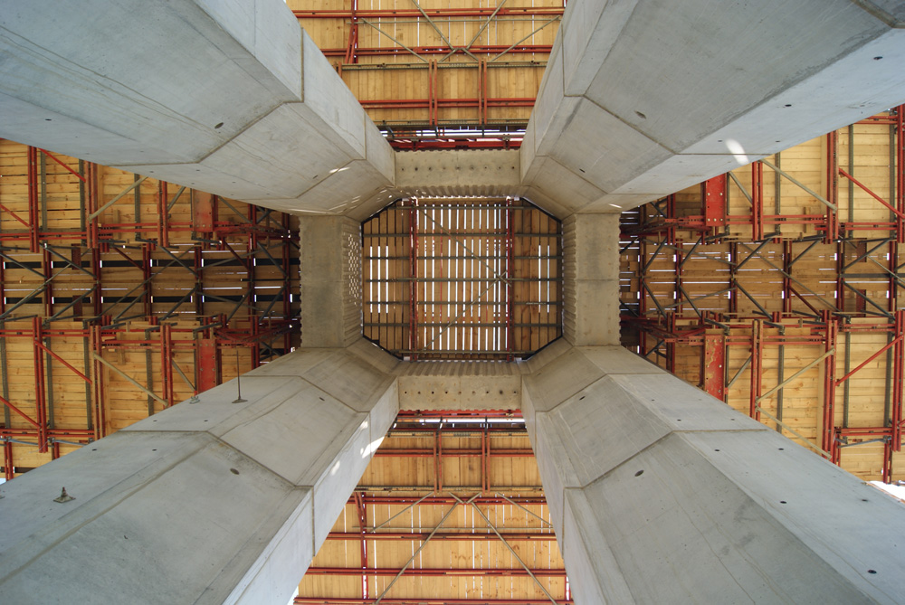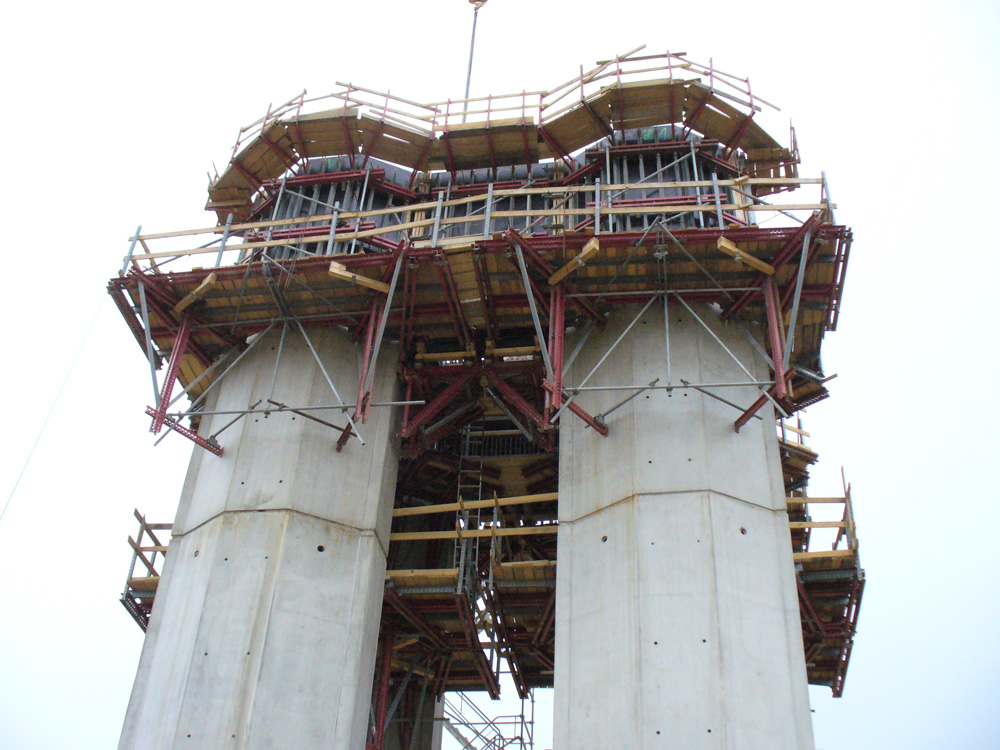 Tanto os pilares, como os encontros e a aduela 0 foram construídos com uma fôrma modular baseada na tecnologia do MK. Como a estrutura de suporte para realizar a parede de reforço, foram utilizados consoles de grande carga MK, que igualmente ao sistema trepante, se adaptou perfeitamente ao formato dos pilares.