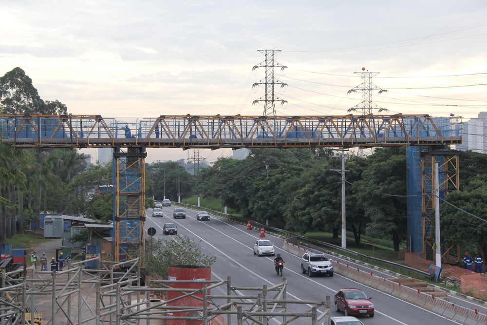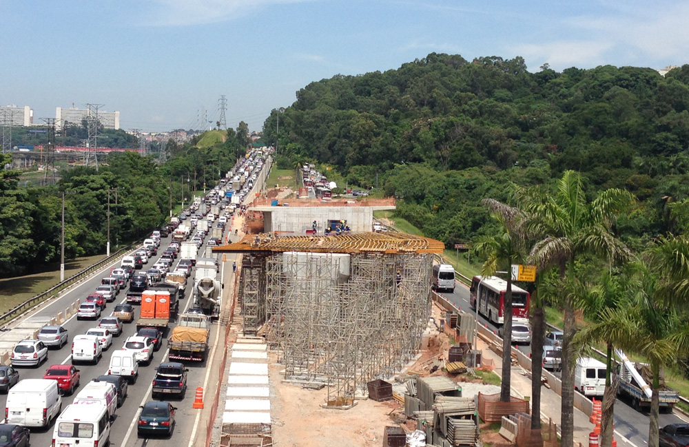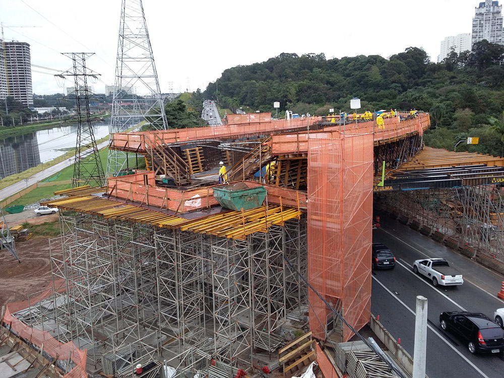 Devido ao grande fluxo de veículos da Marginal Pinheiros, e a impossibilidade de bloqueá-la, para solucionar o escoramento neste trecho, foram utilizados Perfis Especiais que passam por cima da pista expressa da Marginal, sentido Interlagos, e suportam a cofragem ENKOFORM para execução do fundo e muros do caixão da ponte, com excelente acabamento de betão aparente. Nos demais trechos onde não havia fluxo de veículos, as torres de escoramento T-60 executaram com grande produtividade. O Cimbre BRIO resolveu o escoramento interno do caixão da ponte com seu sistema ligeiro e produtivo.