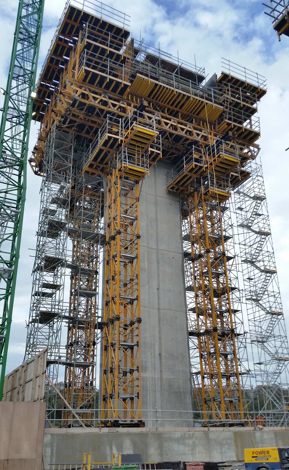 A aduela 0 dos pilares 4 e 5, de 21 m de largura e 12 m de comprimento foi executada com a fôrma ENKOFORM HMK e dois sistemas de escoramento. O sistema de fôrma foi dividido em 5 módulos. Um de 3,4 m sobre o pilar e apoiado com torres de escoramento T-60 de 23 m de altura e quatro módulos de 2,5 m apoiados em 8 Treliças e Torres de Escoramento MK. A conexão longitudinal do conjunto de fôrma foi realizada com perfil de 12 m.