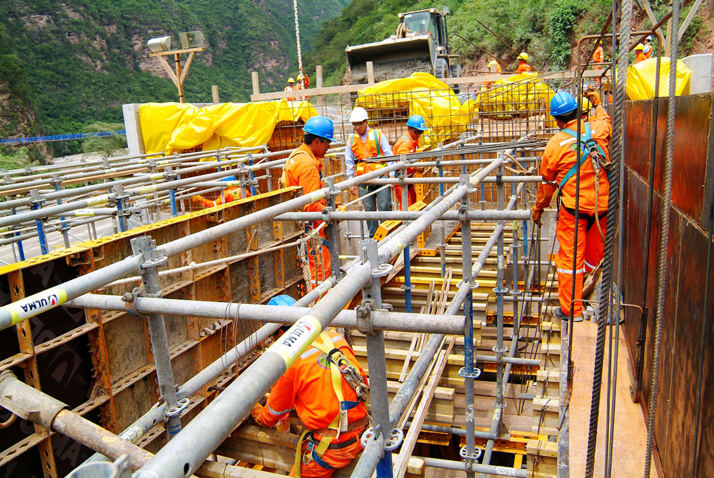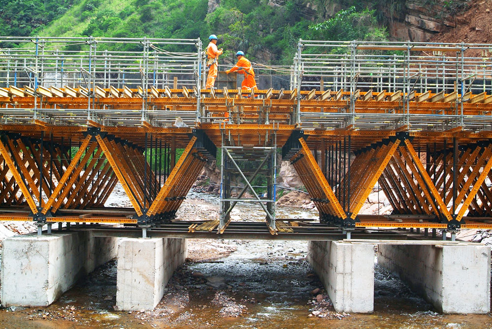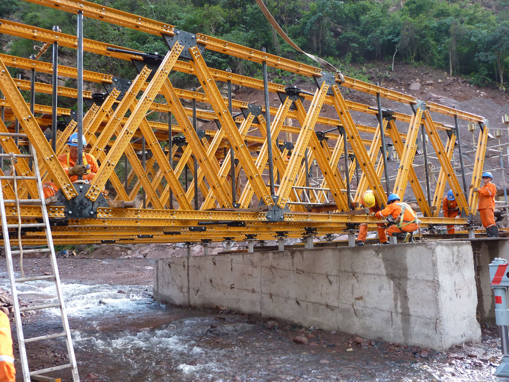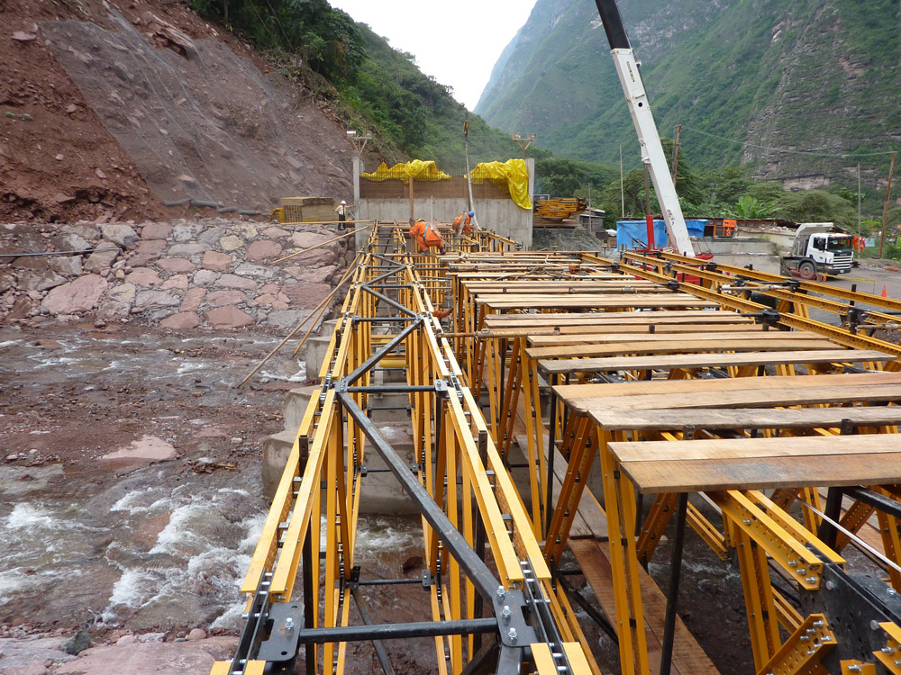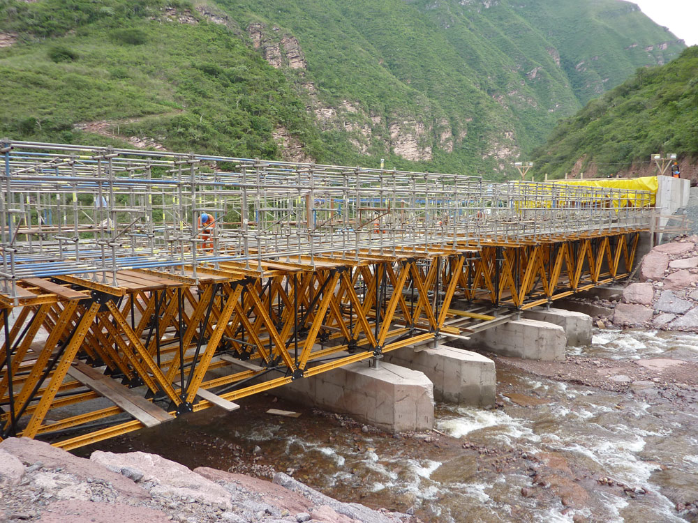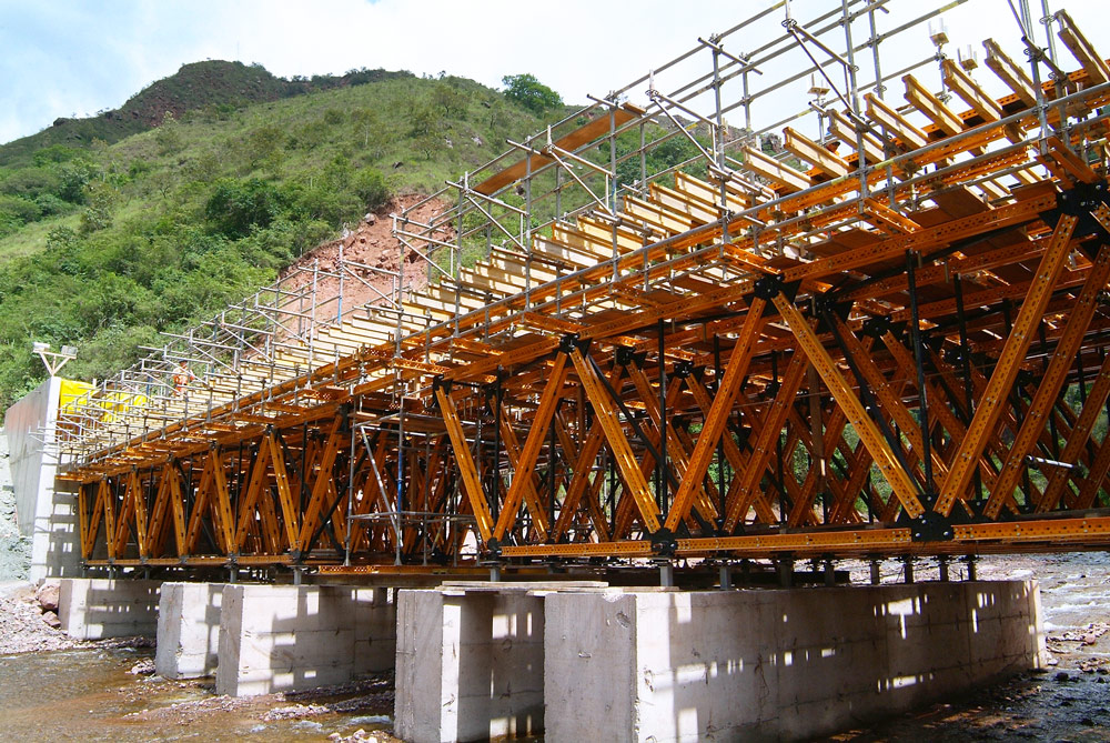 Foram montadas estruturas com Treliças MK. De 2,6 m de largura e bem fixadas, foram instaladas sobre as bases de concreto no leito. Como base para o Cimbre BRIO, se colocaram Riostras MK em perpendicular, que serviram de apoio as vigas de madeira VM-20. Sobre esta base, a fôrma portátil COMAIN cobriu os laterais e fundos de viga.