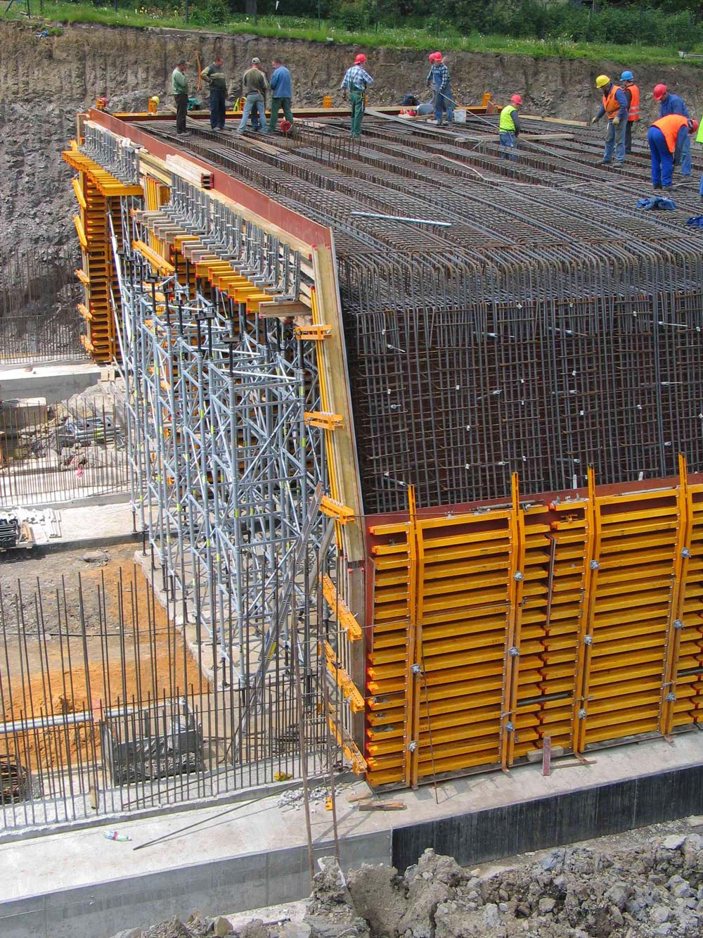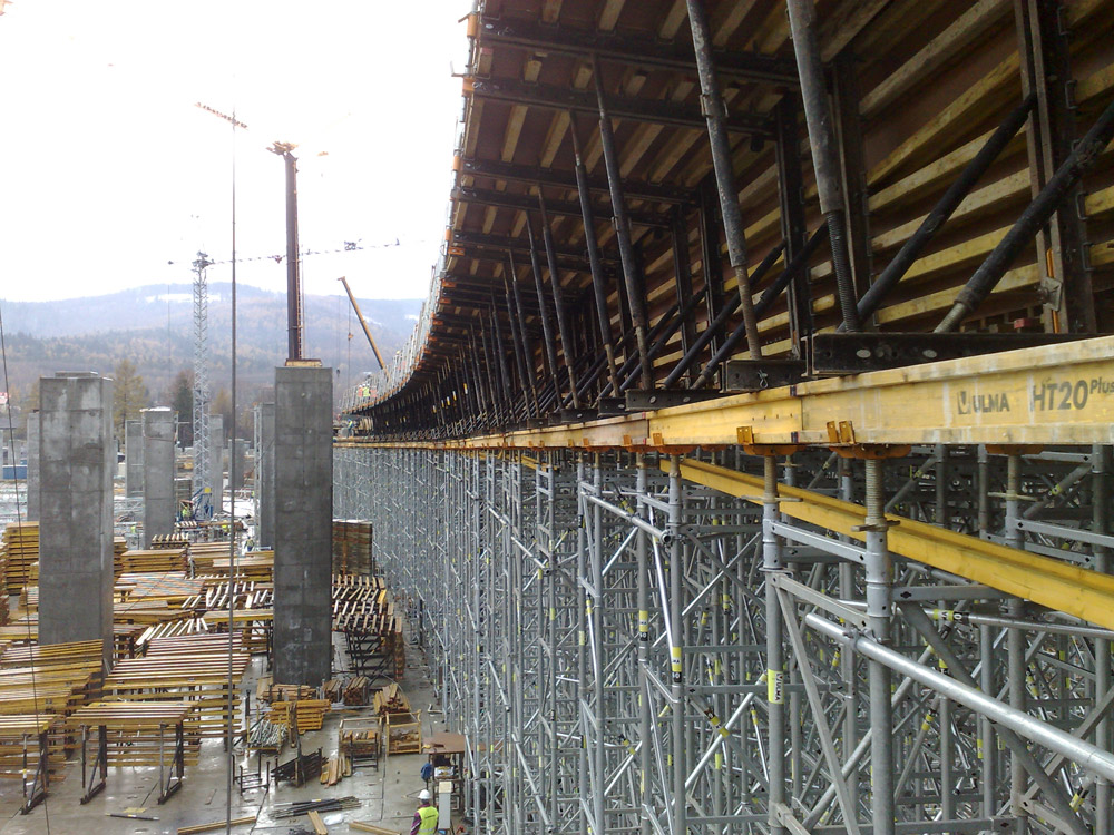 Como sistema de fôrma para o tabuleiro foi utilizado o ENKOFORM HMK, adaptável a qualquer seção com peças padrão. Em escoramento, o Cimbre T-60 acelerou o processo construtivo, bem como transmitiu as cargas de forma segura, a mais de 15 m de altura.