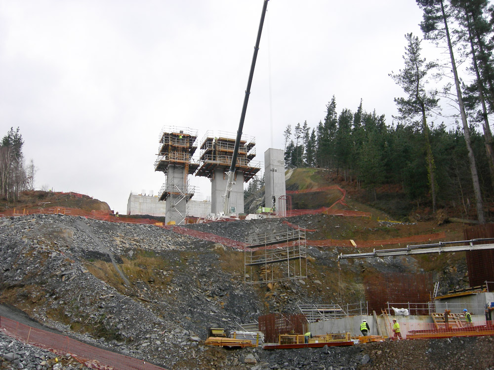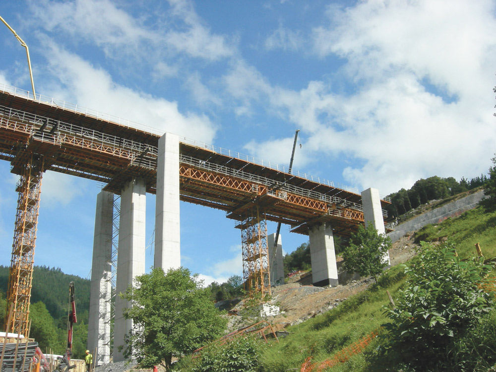 A seção do tabuleiro de caixão, com cantos de 3,64 m é executada em duas fases, através da fôrma ENKOFORM HMK. Primeiro se realiza o fundo e as laterais e em seguida é realizado o trecho das abas.