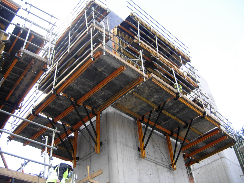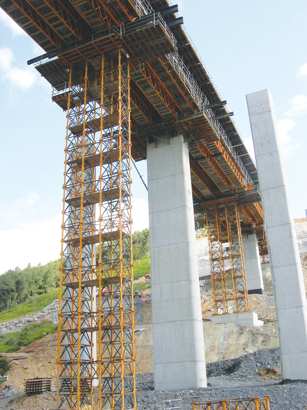 O escoramento em pórtico é realizado com Cimbre T-500 e Treliças H-33, transmitindo as cargas a uma torre provisória em cada vão e aos pilares usando Consoles MT.