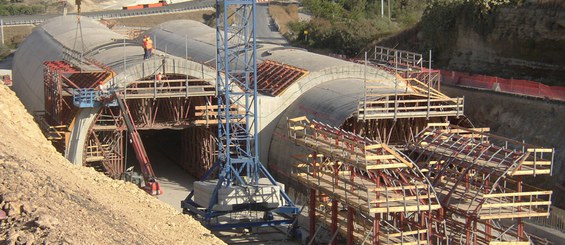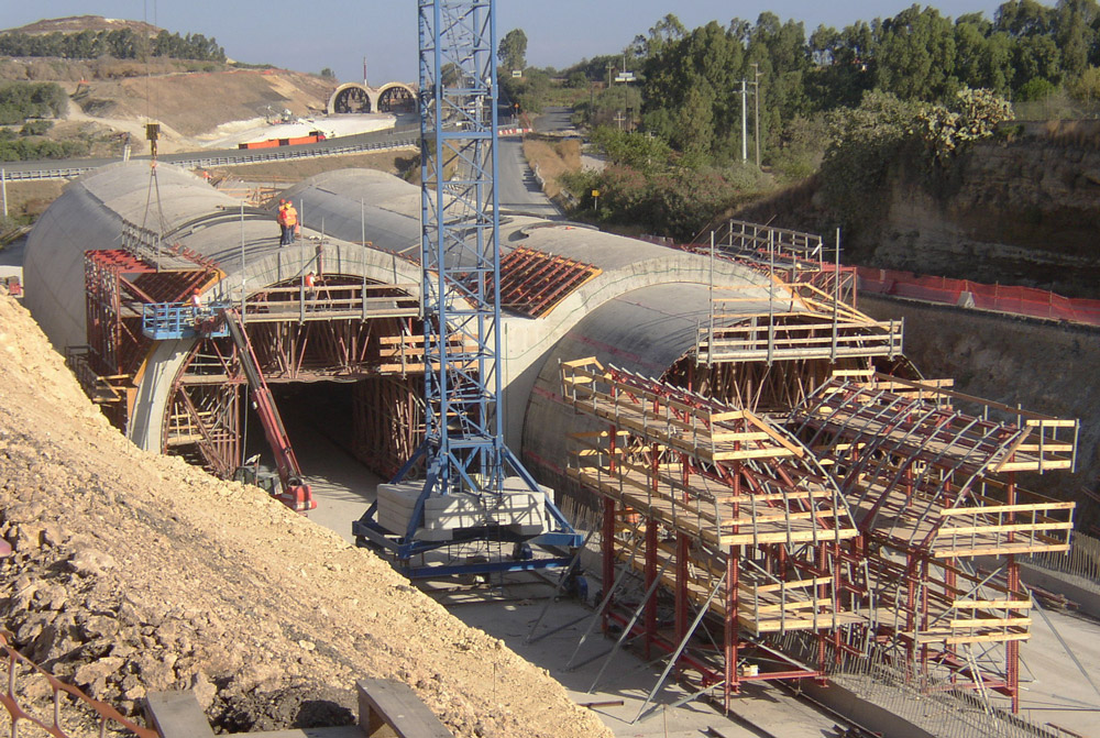 O falso túnel de via dupla faz parte das obras da estrada que circula entre Catania e Siracusa. Com um comprimento aproximado de 800 m, ambos os túneis dispõem de 30,5 m de largura, com uma altura máxima, desde a fundação até o arco, de 9,5 m e um diâmetro interno de 13,5 m. A execução das duas galerias foi realizada de forma simultânea, a céu aberto e com elementos padrão de Estruturas MK.